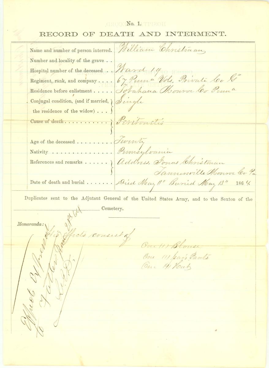 View and download the Record of Death and Interment on the National Archives Catalog. You can explore more of our holdings by visiting our online Catalog or by visiting the National Archives in Washington, DC. This record is located with Record Group 94: Records of the Adjutant General's Office, Series: Carded Records Showing Military Service of Soldiers Who Fought in Volunteer Organizations During the American Civil War, File Unit: Compiled Military Service Record of William Christman, 67th Pennsylvania Infantry Regiment. Many of the records in this collection have yet to be digitized. We encourage researchers to visit us onsite to explore these records and learn more about the archival collections held in the National Archives in Washington, DC.