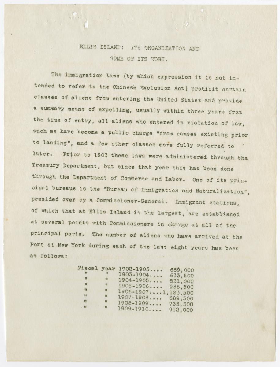 The documents in this file describe the administrative organization and major responsibilities of the federal immigration station at Ellis Island in the years 1909–1911. The file provides insight into inspection processes for immigrants arriving at Ellis Island and the ways in which immigration officials applied federal immigration law at the station, among other topics. Between 1892 and 1954, the Ellis Island immigration station processed nearly 12 million immigrants to the United States.