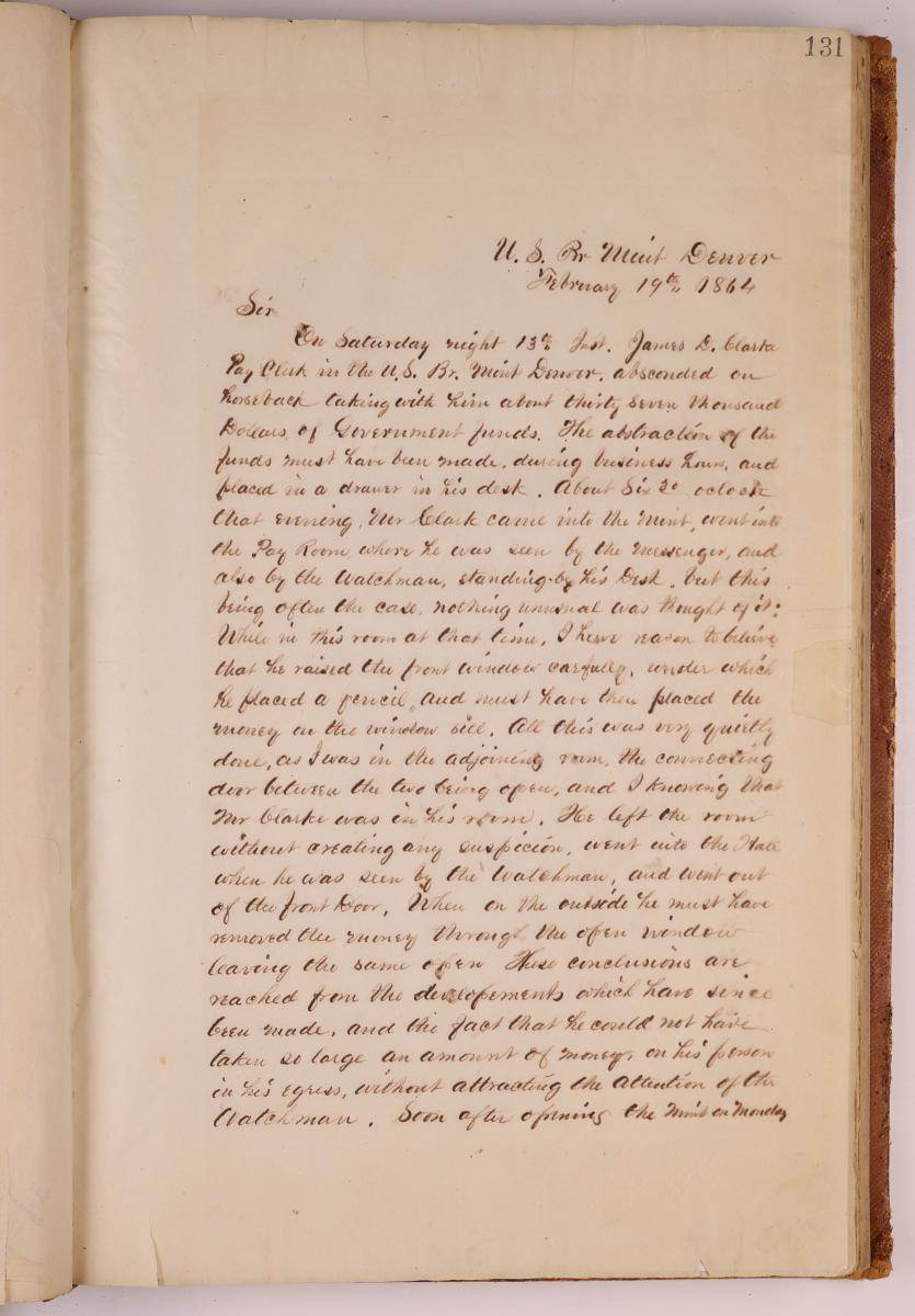 This document is one of many letters between the Superintendent of the Denver Mint and the Secretary of the Treasury detailing the robbery committed on the night of February 13, 1864, by James D. Clark. Clark was a pay clerk at the Denver Branch of the U.S. Mint. He absconded in the night on horseback, taking with him about $3,700 of government funds, greenbacks, and gold. After the robbery was discovered, Superintendent of the Denver Mint George W. Lane wrote this letter to Secretary of the Treasury Salmon P. Chase, throwing himself on the Secretary’s mercy for having laid his trust in Clark. Another letter was sent on March 12, 1864, confirming the arrest and jailing of Clark by Amos Lane, son of the Superintendent, and the El Paso County Sheriff. Clark had made it as far south as the Arkansas River.