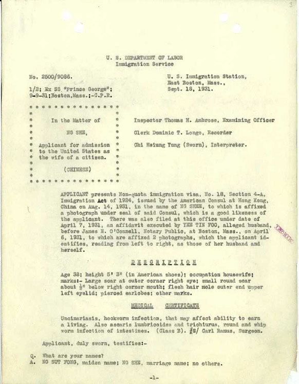 - Ng Shee, through this sworn statement, relates being born in China in 1894 and desires to enter the United States through Boston, MA, to live permanently with her husband Yee Tin Foo in Waltham, MA. For what reason does she claim to be eligible for a Nonquota Immigrant Visa?