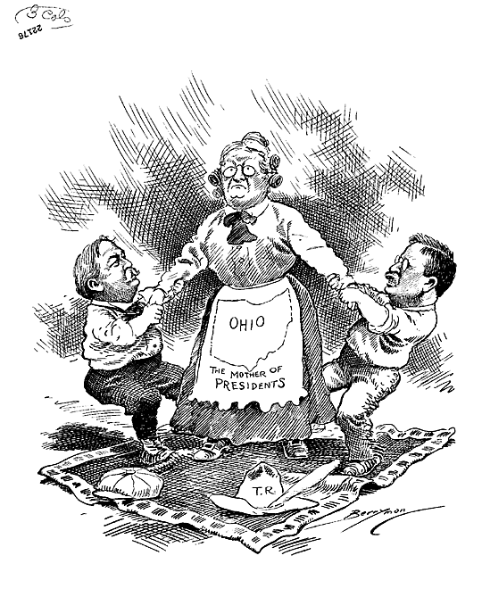 The first two featured documents, both political cartoons, satirize Roosevelt's reversal of his anti-third term promise and his assumption of leadership of the Progressive Party. Both La Follette and Roosevelt lost the Republican nomination to the incumbent, Taft, who still controlled the national convention delegates. Roosevelt, however, had swept 9 of the 12 states with primaries, including Taft's home state of Ohio. This primary battle is characterized in the third featured document, a political cartoon picturing Ohio as the "Mother of Presidents." Victories in these primaries made Roosevelt and his progressives confident that they represented the will of the people. They officially announced their Progressive Party and challenged Taft and the Democratic candidate, Woodrow Wilson. The fourth featured document, another political cartoon, displays the three candidates shortly before election day in 1912.