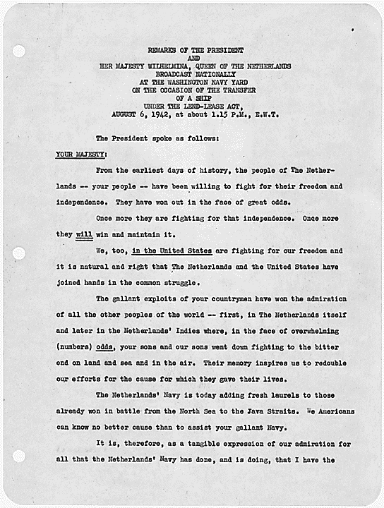 Two of the documents featured in this lesson, the typewritten drafts of Franklin Delano Roosevelt and Winston Churchill's Christmas Eve greeting from the White House in Washington, D.C., on December 24, 1941, and the remarks of the president and Queen Wilhelmina of the Netherlands are housed at the Franklin D. Roosevelt Library in Hyde Park, NY.
