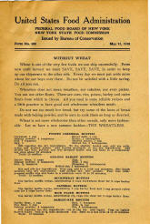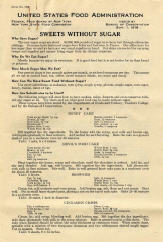 In the pamphlets "Without Wheat," "Sweets without Sugar," and "Potato Possibilities," the Federal Food Board of New York provides alternatives to more well-known recipes to help Americans do their part in the war effort.