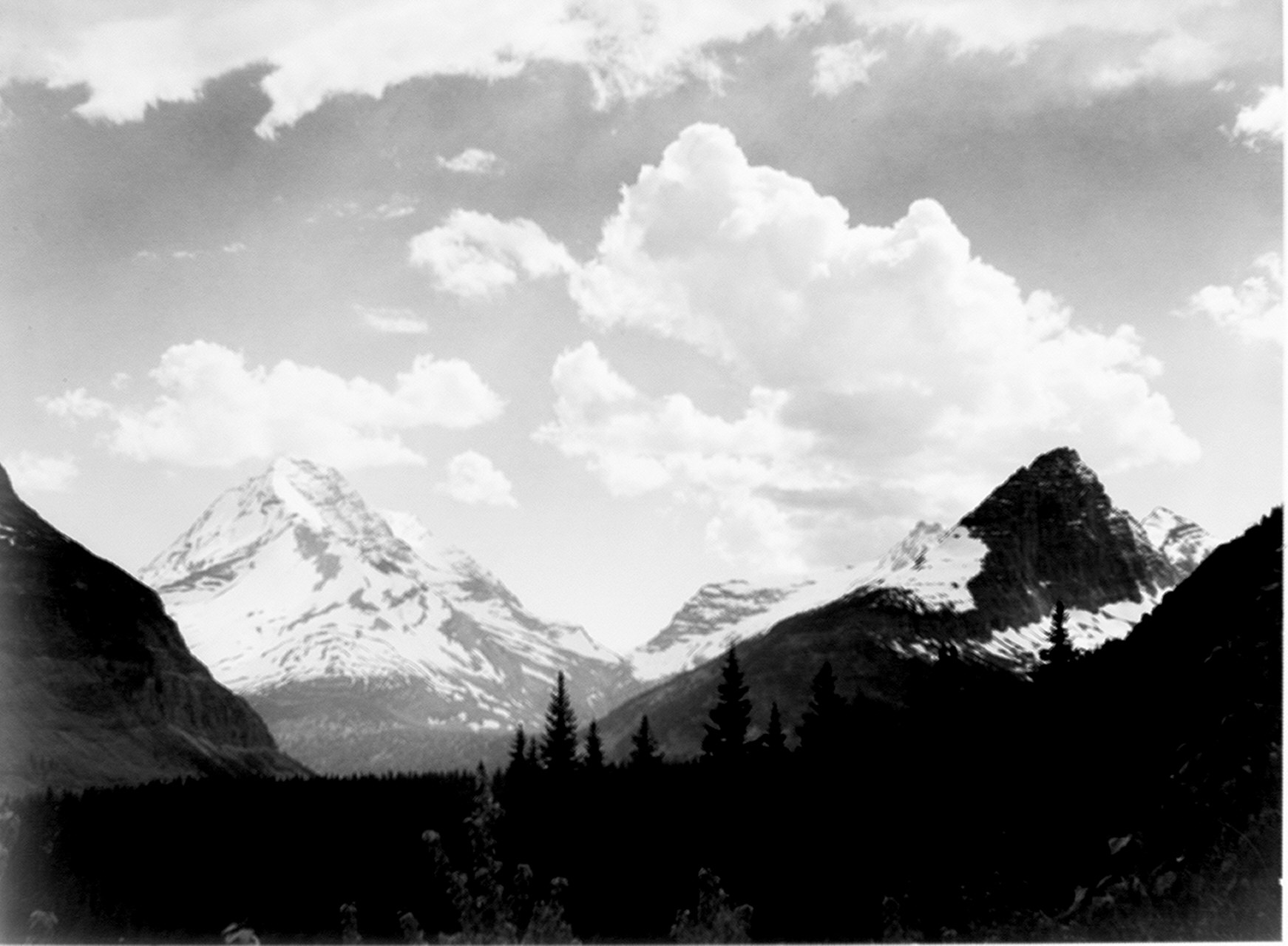 | 519857 | 79-AAE-2 | " In Glacier National Park," valley, snow covered mountains in background. |