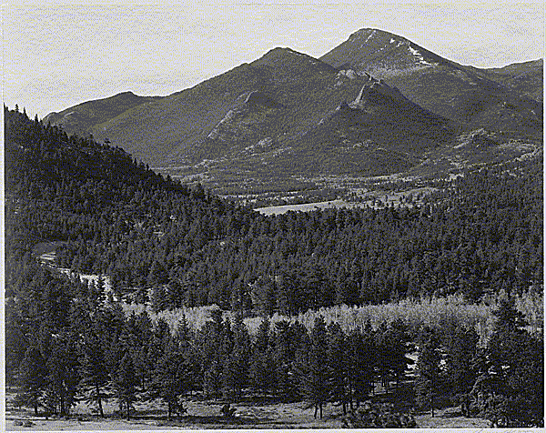 | 519954 | 79-AAM-1 | " Long's Peak from Road. Rocky Mountain National Park," panorama of trees and snow-capped mountains. |