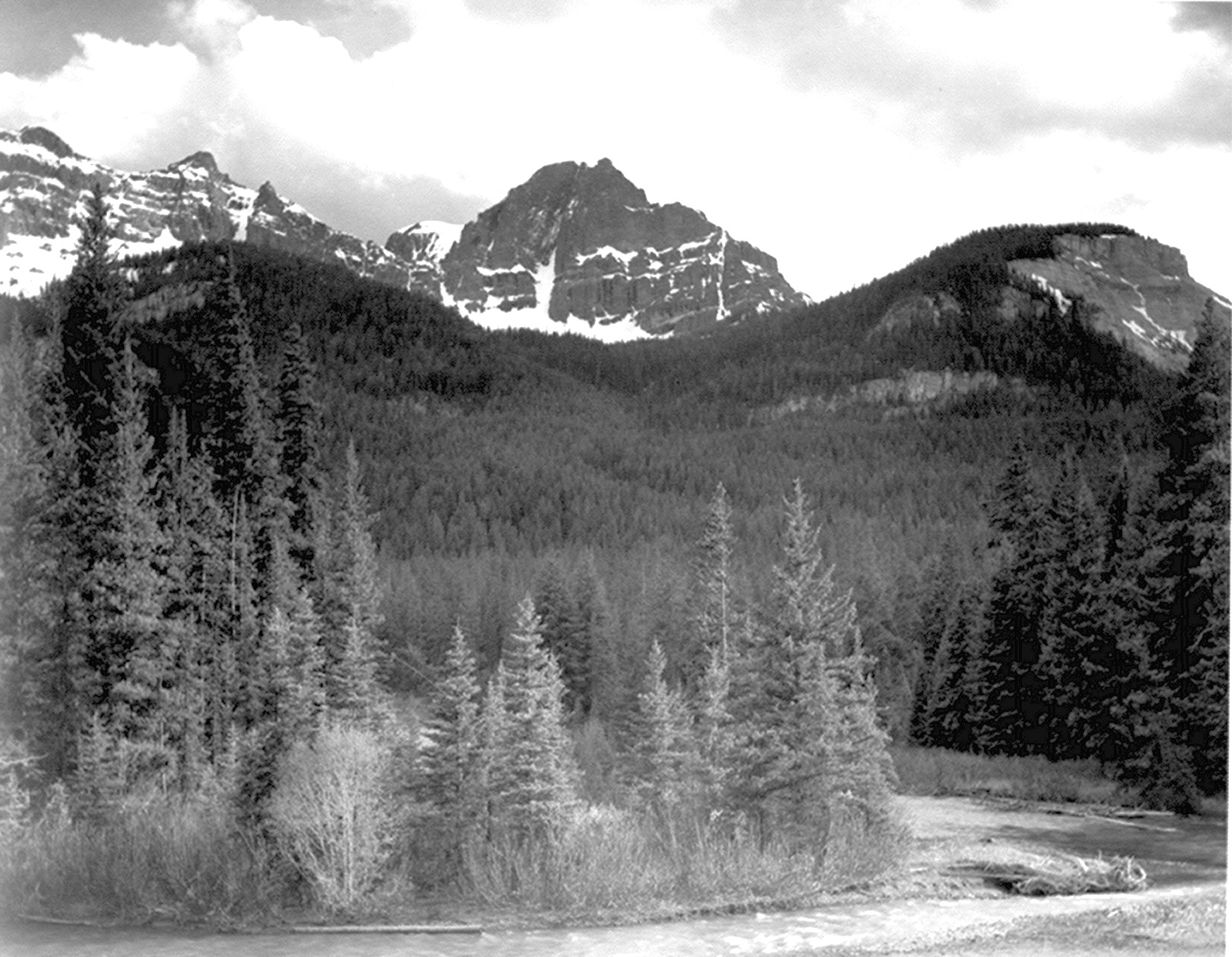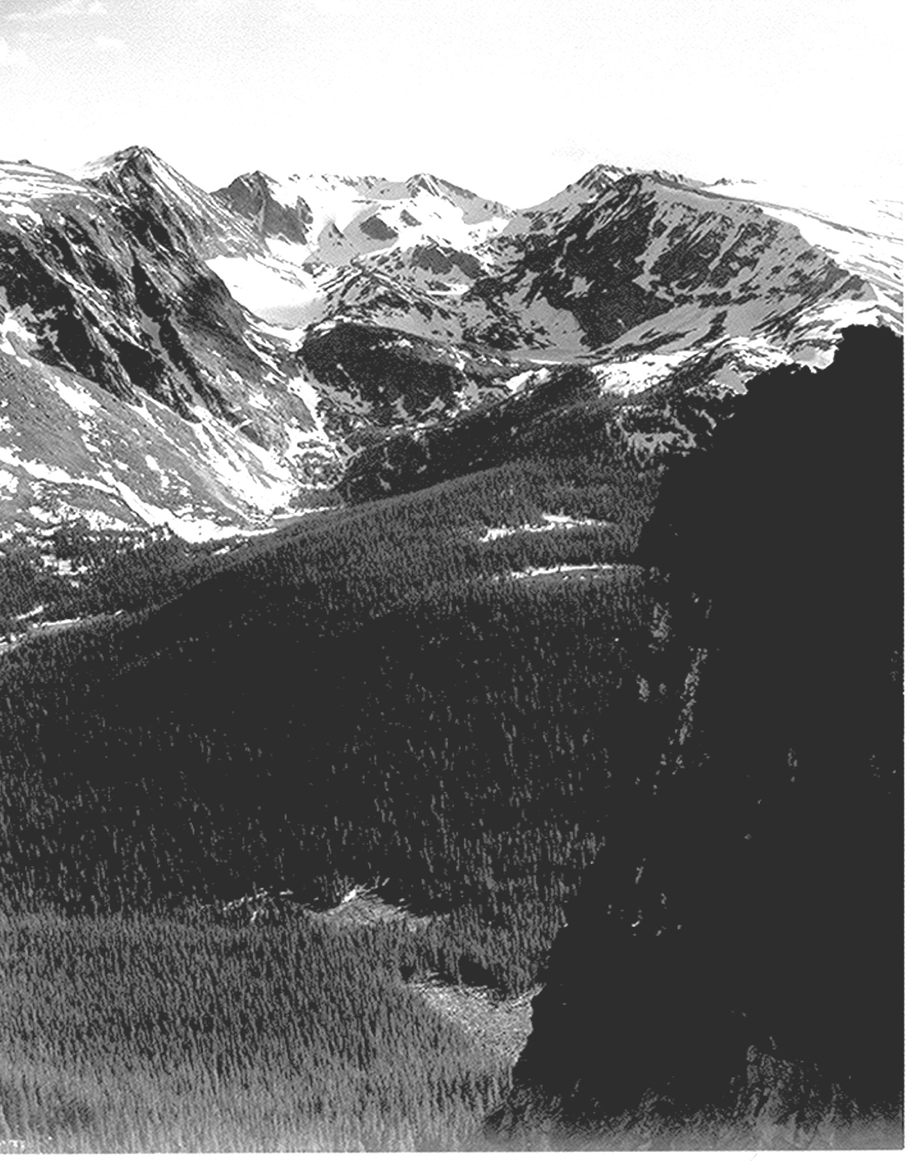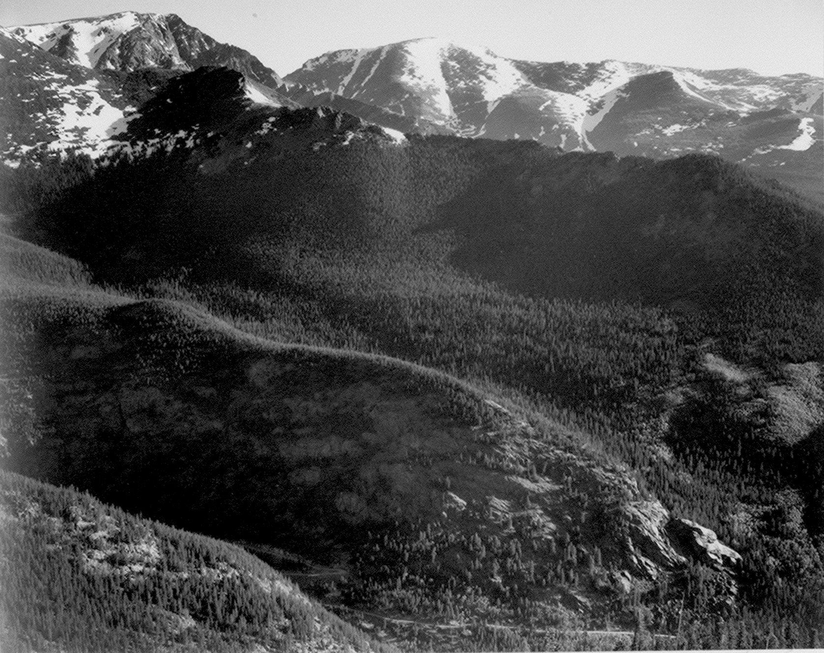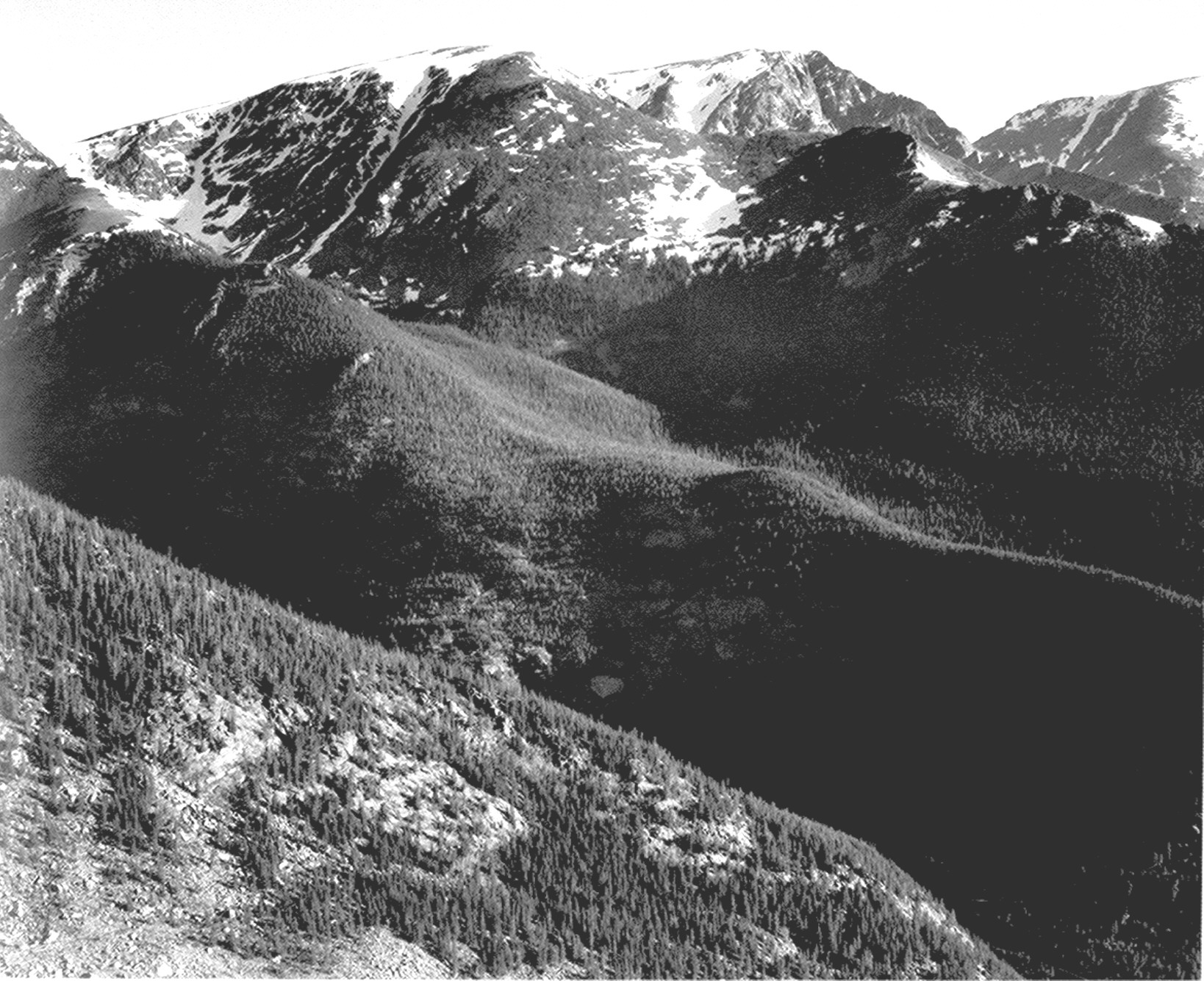 | 519960 | 79-AAM-7 | " Rocky Mountain National Park. Never Summer Range," panorama at timberline, dark foreground, light snow capped mountain, gray sky. |