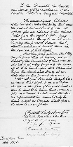 El año después de la ratificación de la decimoquinta enmienda, una petición de derechos electorales enviada al Senado y a la Cámara de Representantes solicitaba que los derechos de voto se extiendan a las mujeres y que las mujeres fueran concedidas el privilegio de ser escuchadas en el Congreso. Fue firmada por Susan B. Anthony, Elizabeth Cady Stanton, y otras sufragistas. Ampliamente conocidas en el movimiento sufragista de los Estados Unidos, Anthony y Stanton organizaron la Asociación Nacional por el Sufragio de la Mujer en 1869.