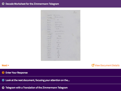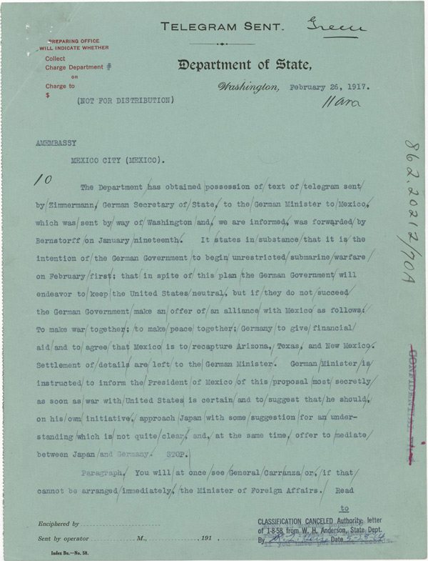 Este texto fue adaptado del artículo, “El telegrama Zimmermann” por Mary Alexander y Marilyn Childress. Cita; Alexander, Mary and Marilyn Childress. "The Zimmermann Telegram." Social Education 45, 4 (April 1981): 266
