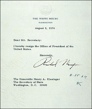 "I hereby resign the Office of President of the United States."During the night of June 17, 1972, five burglars broke into the offices of the Democratic National Committee at the Watergate office complex in Washington, DC. Investigation into the break-in exposed a trail of abuses that led to the highest levels of the Nixon administration and ultimately to the President himself. President Nixon resigned from office under threat of impeachment on August 9, 1974.