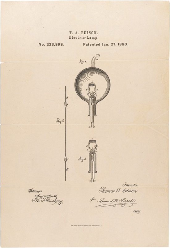Thomas Edison's Patent drawing for an improvement in electric lamps, patented January 27, 1880