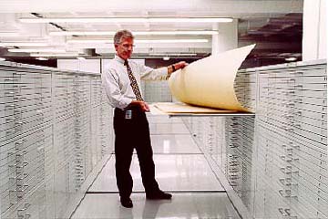 and stored in large horizontal map cases. Large drawings, maps, charts,