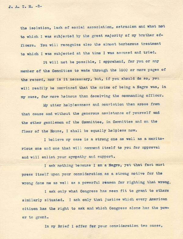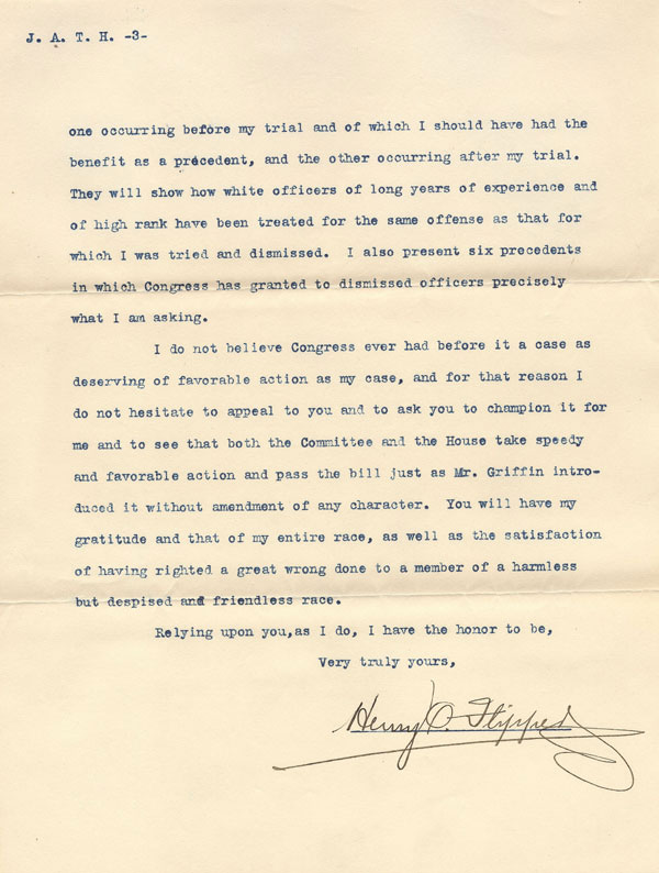 After his dishonorable discharge, Flipper fought to clear his name as he pursued a career as an engineer and an expert on Spanish and Mexican land law. In 1898, a bill reinstating him into the Army and restoring his rank was introduced in Congress on his behalf. To bolster his case, he sent Congressman John A. T. Hull, chairman of the House Committee on Military Affairs, the letter displayed below along with a brief supporting the bill's passage. Flipper's letter to Hull is an eloquent statement asking Congress for "that justice which every American citizen has the right to ask." The bill and several later ones were tabled, and Flipper died in 1940 without vindication, but in 1976, the Army granted him an honorable discharge, and in 1999, President Bill Clinton issued him a full pardon.