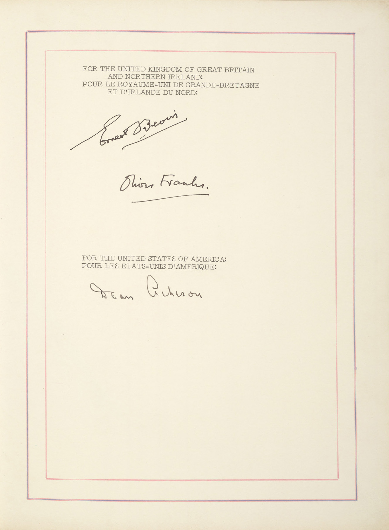 On April 4, 1949, Secretary of State Dean Acheson and the foreign ministers of Canada, and 10 Western European nations (Belgium, Denmark, France, Great Britain, Iceland, Italy, Luxembourg, the Netherlands, Norway, and Portugal) gathered in Washington, DC, to sign the North Atlantic Treaty. In his memoirs, Dean Acheson recalled "All the North Atlantic Treaty ministers met in Washington on April 2 to approve the draft treaty and arrange for its signature at a ceremony set for April 4. Here President Truman again showed his consideration for me. I had told him that it would be appropriate and fitting for him to sign the treaty on behalf of the United States, but this he refused to do. He would attend the ceremony and stand beside me as I signed, but the treaty would bear my name."