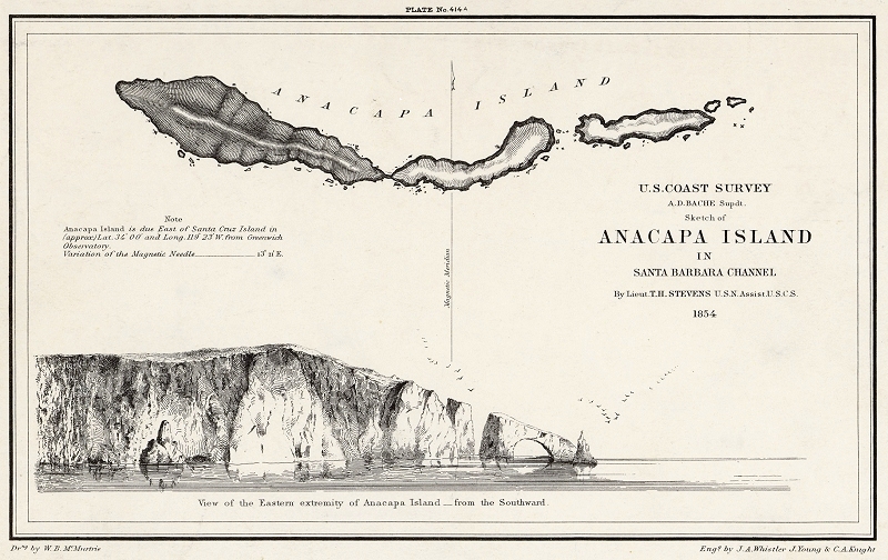 However, his unconventional work habits and his inability to conform to government routine led to his dismissal on January 9, 1855.One of the known works completed by Whistler during his brief federal service, "Sketch of Anacapa Island," 1854, exemplifies Whistler's need to add his personal touch to official charts. After he completed this etching in the approved style, he thought it looked dull. Therefore, he added two flocks of gulls sailing gracefully over the rocky headland.