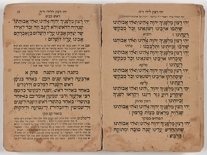 In many Jewish communities, a variety of symbolic foods, such as pomegranates and dates, are eaten in a home ceremony to usher in Rosh ha-Shanah, the Jewish New Year. Each food is accompanied by a prayer that this food will serve as a good omen for the year to come. This prayer book features the liturgy for Rosh ha-Shanah synagogue services as well as the text for this home ritual.
