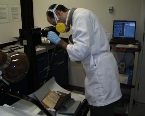 Sorting the damaged books and documents in a fume hood