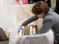Following a joint process in which 49 of the fragments (the 50th is being exhibited) were formally reviewed and checked by the Iraqi ambassador, Lukman Faily, a representative of the Iraqi Minister of Culture, and Doris Hamburg, director of Preservation Programs at the National Archives and Records Administration, the fragments were placed in a sealed trunk for their trip to the New Montefiore Cemetery in West Babylon, New York, where they were buried on December 15, 2013.
