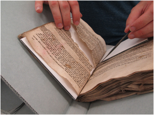 Book leaves were treated following the same treatment protocols as loose archival documents. Except for books included in the exhibit, damaged book covers and binding structures were not repaired. To permit imaging of tightly bound volumes, sewing threads were sparingly cut or loosened to permit books to open more fully while retaining bound structures.