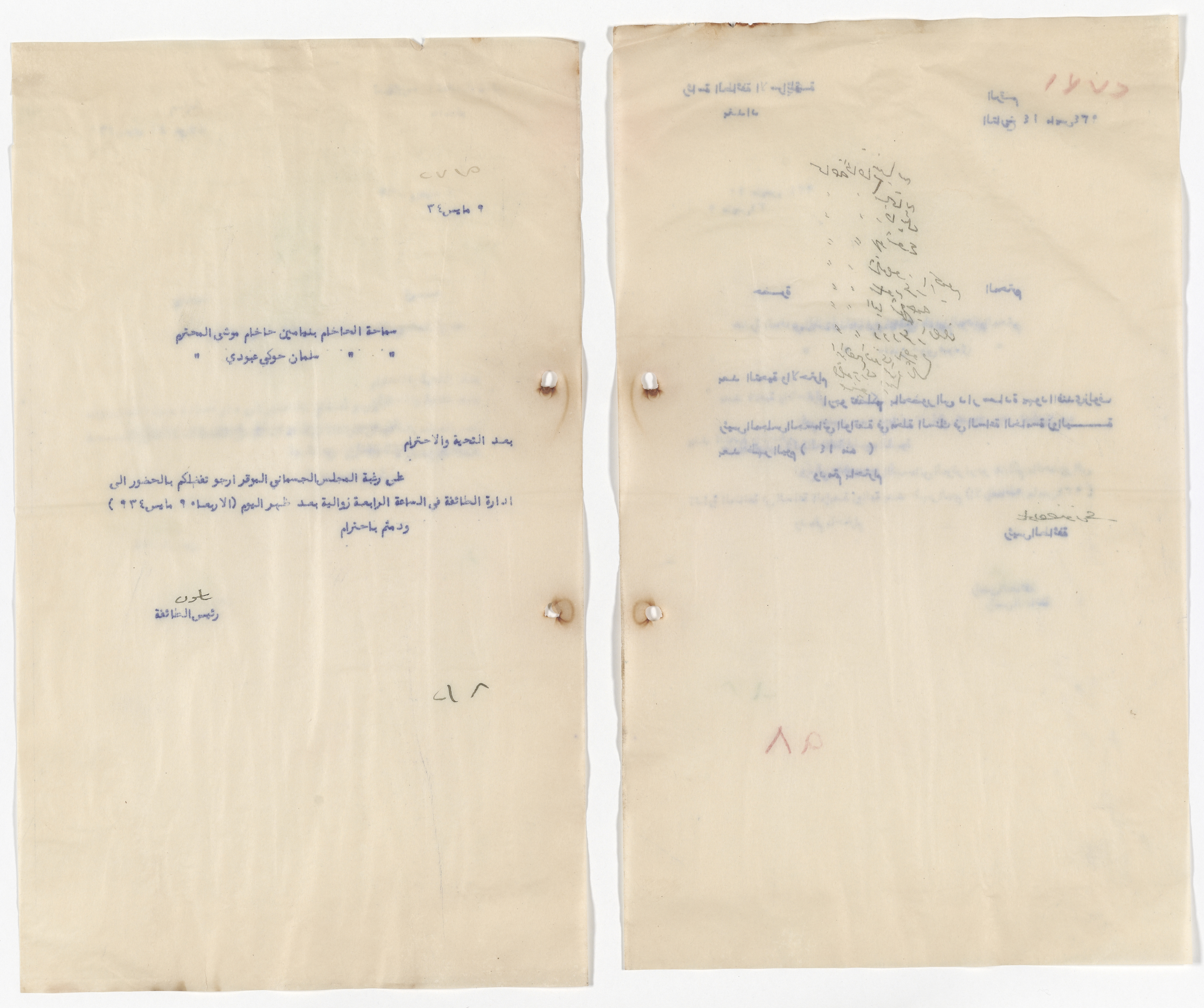 In photographing these materials, our primary goal was to share highly legible images via a user-friendly web-site interface. A large portion of the items in the Iraqi Jewish Archive were water damaged, resulting in ink bleeding through pages and into adjacent pages within ring binders. We imaged these pages as “spreads,” two pages side by side—akin to book spreads. This method improves the page flow and provides better context for understanding why transferred ink appears on unrelated pages.