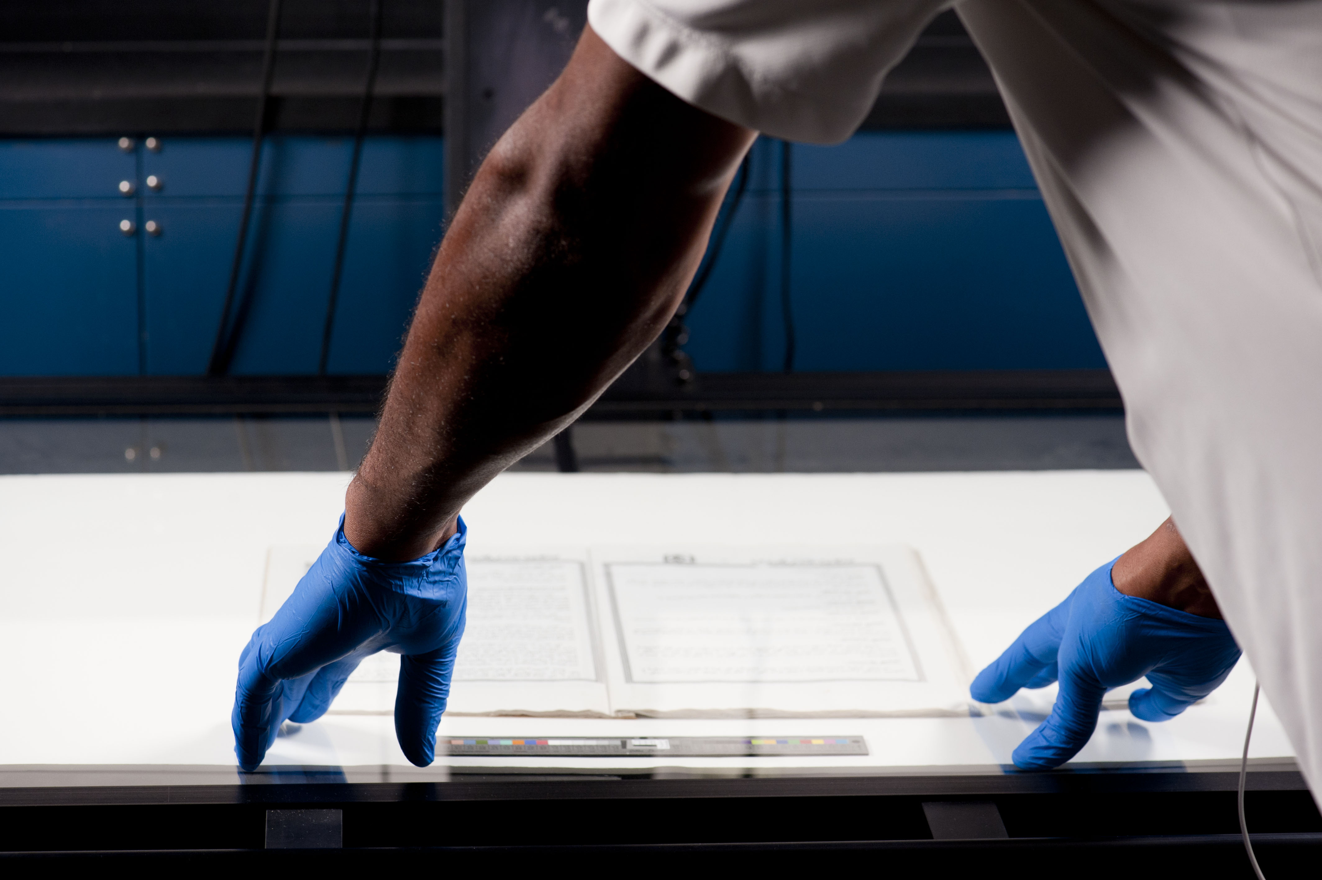 We take great care to minimize the risk of damage to originals. The majority of the items are photographed while held flat inside a glass-topped book cradle. Technicians precisely control the amount of pressure exerted on the paper when the glass is closed. While some of the books are in suitable condition for the book cradle, others cannot be laid flat without damaging the bindings. For these items, custom supports maintain a book in a partially opened position, which allows safe imaging of the book, one page at a time, outside of the glass cradle.