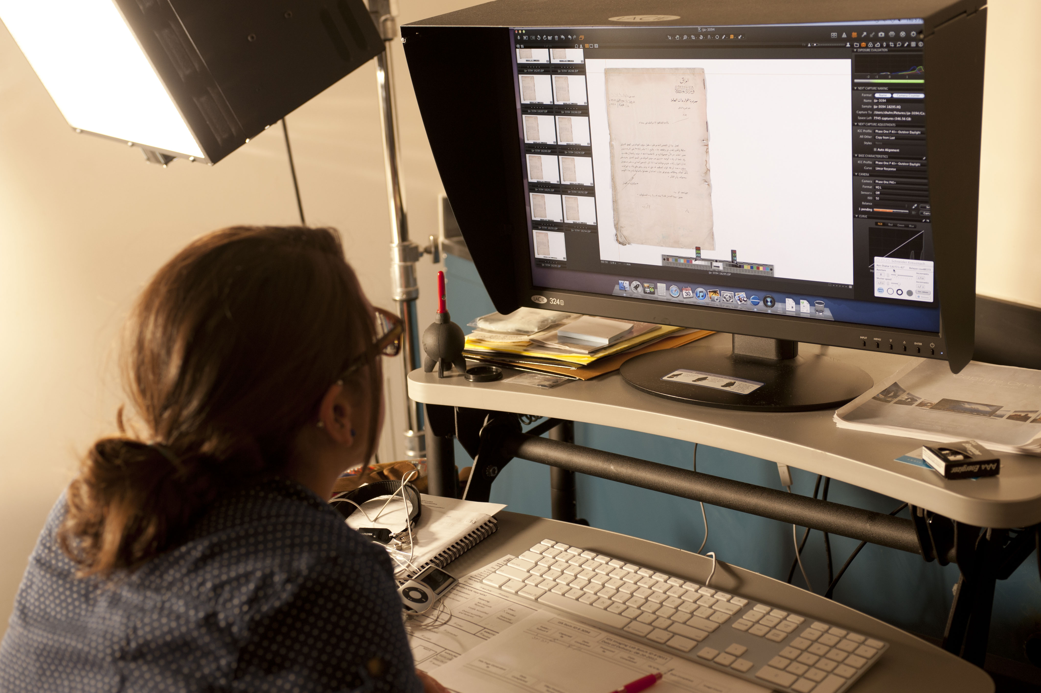 To digitize books and documents in the Iraqi Jewish Archive, state-of-the-art overhead camera sets, specifically designed for imaging in cultural heritage applications, were used. Overhead cameras were selected over flatbed scanners because they ensure safer handling of materials and enable greater productivity. Depending on the size and condition of the originals, technicians can capture between 600 and 1,200 images a day with these cameras. Images are displayed on a computer screen attached to the camera, allowing focus and exposure to be adjusted rapidly when required.