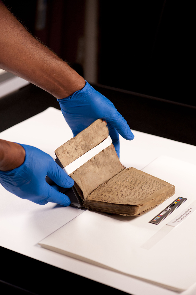 Following mold remediation, the primary goal of conservation was to stabilize materials to permit safe handling during imaging and to digitally capture as much information as possible. Tears and losses that extended into text or that caused structural weakness were mended or filled using conservation-quality long-fibered papers and stable adhesives. To eliminate harsh contrast between mends and book and document pages, mends were color toned to appear less starkly white and more neutral.