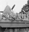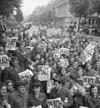 in front of 'Rainbow Corner' Red Cross club in Paris to celebrate