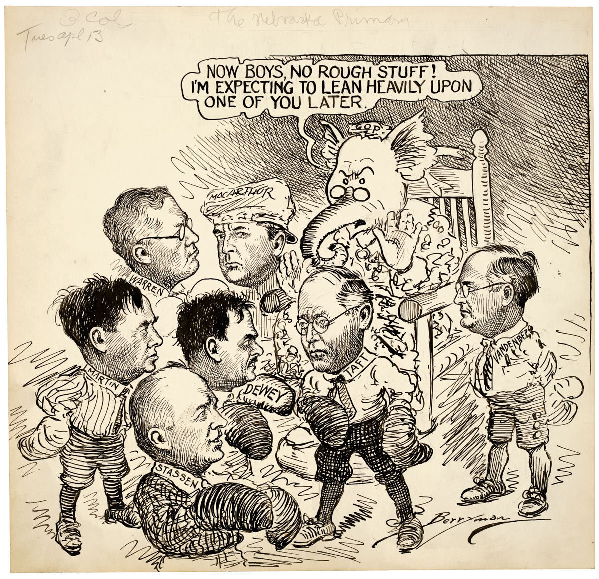 Primary elections begin with a large number of candidates, and as the primary season progresses, the field narrows until a single candidate remains. This cartoon, printed in the Washington Evening Star on the day of the critical 1948 Nebraska primary, shows the Republican Party elephant as a watchful mother chastising her “sons” for their bitter infighting. She knows a divisive primary may hurt the prospects of the party’s eventual nominee in the general election.