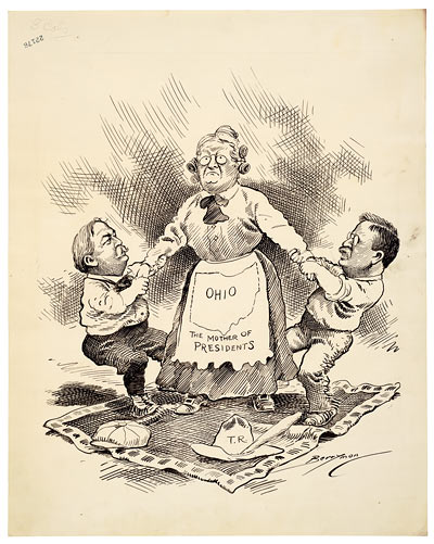 In 1912, former President Theodore Roosevelt returned to challenge the unpopular incumbent President William Howard Taft for the Republican nomination. This cartoon illustrates the critical Ohio primary with Taft tugging on one arm of “mother” Ohio—his birth place and home of the most Presidents. Roosevelt is shown tugging on her other arm, hoping to steal her away. Roosevelt handily won the Ohio primary but ultimately lost the Republican Party nomination to Taft. Roosevelt went on to run in the general election as the nominee of the newly formed Bull Moose Party.
