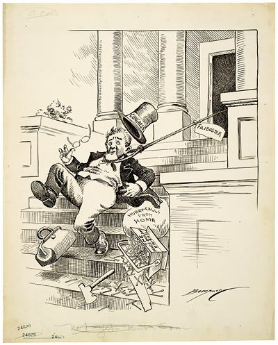 This cartoon appeared on the last day of the lengthy second session of the 62nd Congress. Members of Congress were eager to return home to campaign for reelection and garner support for their party’s Presidential candidate. Two threats of filibuster held up Congress’s adjournment—a resolution on campaign finance and the House’s refusal to accept the Senate’s amendments to the general deficiency bill.
