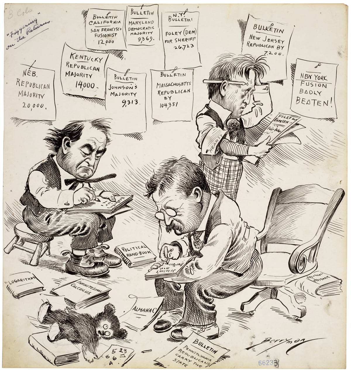 In this cartoon, William Jennings Bryan, William Randolph Hearst, and President Theodore Roosevelt closely examine the 1907 state and local election returns to try to predict the possible impact these returns may have on their own political futures. The books scattered around the floor suggest that forecasting the consequences that result from an election is as challenging as doing “infinitesimal calculus.”