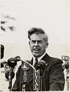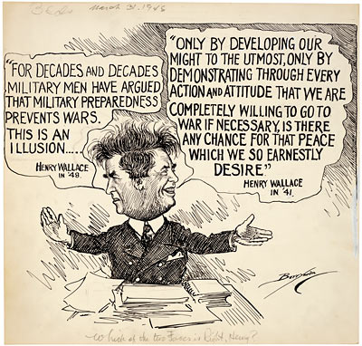This cartoon, printed before the 1948 Presidential election, shows Progressive Party Presidential candidate Henry Wallace flip-flopping on defense policy. As Vice President during World War II, Wallace staunchly defended military preparedness as a deterrent to war. In 1948, Wallace changed his position and argued that military preparedness would not prevent confrontation.
