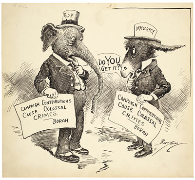 Campaign contributions and expenditures have historically led to controversy. This cartoon references a speech given by William Borah, a maverick Republican Senator from Idaho, on the Senate’s investigations of corruption in the government and in campaign contributions in particular. Both the Republican elephant and the Democratic donkey are perplexed by Borah’s statements; they ask each other “Do YOU get it?” suggesting that neither of them wants to give up their lucrative campaign fundraising efforts.