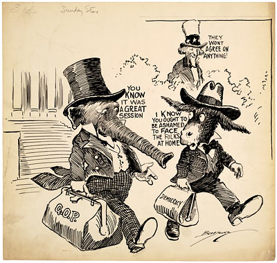 As they exit the Capitol and return home to campaign for reelection, the Republican elephant and Democratic donkey have differing perspectives on the session. The elephant remembers Republican successes while the donkey remembers the Republican majority’s failures; each hopes this leads to their party’s victory in the upcoming election.