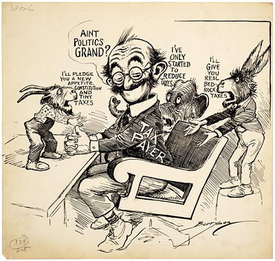 With the 1924 Presidential and congressional elections only two weeks away, politicians of all parties began to promise lower taxes to woo voters. In this cartoon, “Mr. Tax Payer” revels in all the attention as the Republican elephant, the Democratic donkey, and the Progressive goat try to outdo each other.