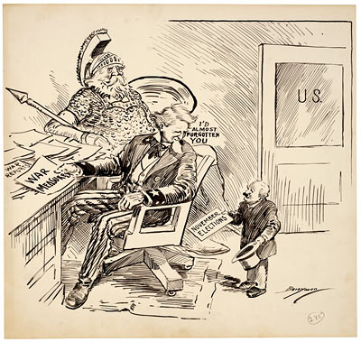 As World War I raged, Government officials had little time to think about local and state elections. In this cartoon, the god of war looks on while Uncle Sam peruses reports on the war. A small, almost overlooked figure, representing the voter, interrupts Uncle Sam with a reminder of the impending November elections.