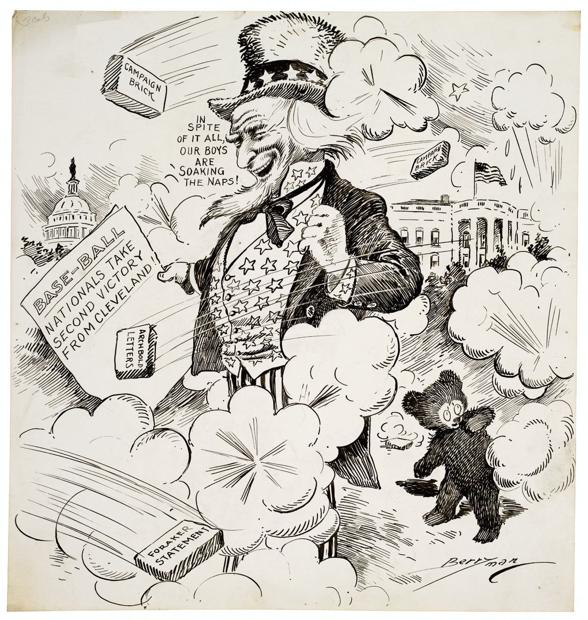 Accusations and scandal characterized the 1908 congressional and Presidential campaigns. In this cartoon, the flying “Archbold” and “Foraker” bricks refer to an election scandal in which Senator Joseph B. Foraker was accused of taking bribes from Standard Oil Vice President John D. Archbold. Foraker subsequently lost his reelection bid. Uncle Sam ignores the bricks and focuses on a more positive subject: baseball. The Washington Nationals had just defeated the Cleveland Naps in two straight games.