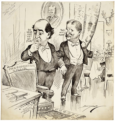 This cartoon shows William Jennings Bryan attending a State Dinner at the White House hosted by departing President Theodore Roosevelt. Bryan, who would soon secure the Democratic nomination for President, is shown looking longingly at the Presidential chair. Roosevelt tries to guide the fixated Bryan back to the dining area, while the teddy bear comments on Bryan’s Presidential dreams.