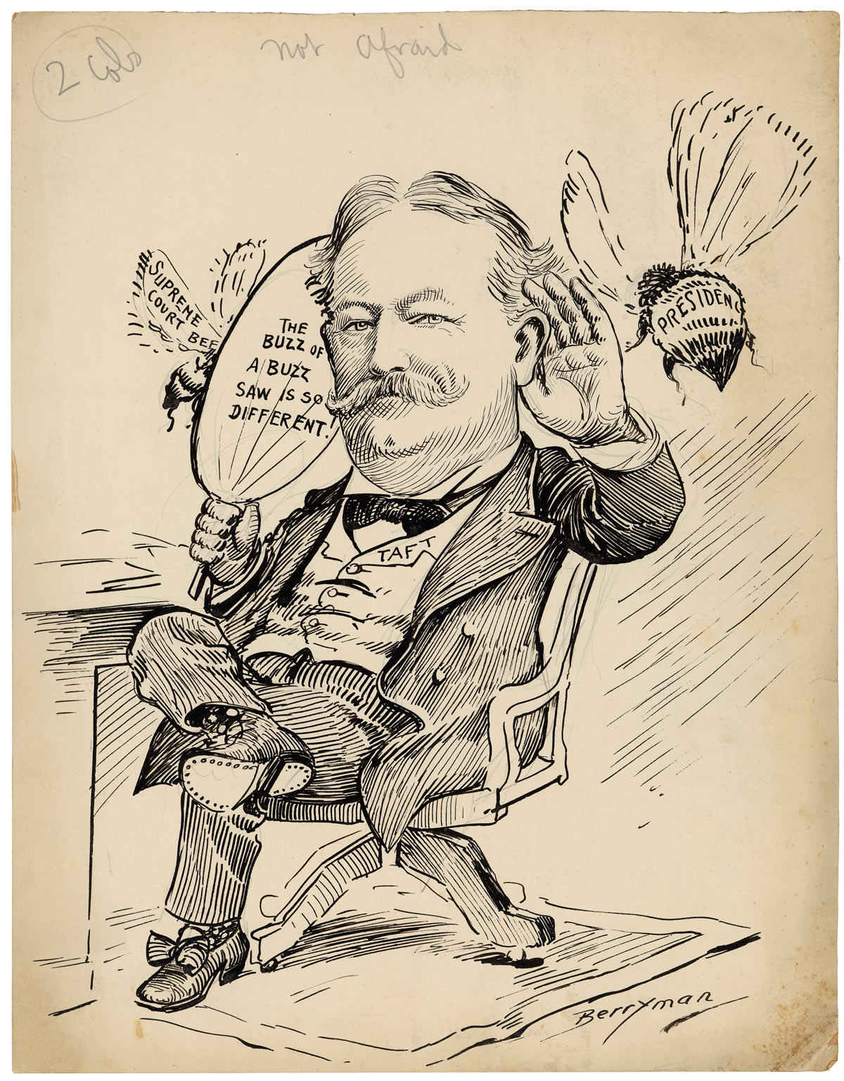 Secretary of War William Howard Taft told President Theodore Roosevelt that his highest ambition was to serve as Chief Justice of the U.S. Supreme Court, but Roosevelt hoped Taft would run in the 1908 election as his successor. With Roosevelt’s encouragement, Taft began to consider the option. In this cartoon Taft blocks the buzz of a potential Supreme Court nomination to better hear the enticing buzz of the Presidential bee. Berryman speculates that Taft may be succumbing to Roosevelt’s wishes and is “not afraid” of running for President.