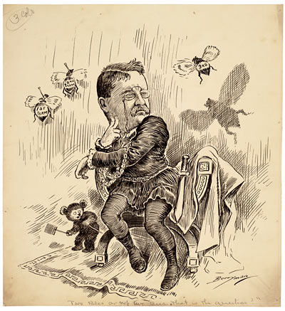 Theodore Roosevelt became President in 1901 after the assassination of William McKinley, just six months into their term. After winning the 1904 election, Roosevelt announced he would honor the two-term tradition by retiring in 1909. However, Roosevelt proved immensely popular and supporters urged him to run for an unprecedented third term. In this cartoon Roosevelt, dressed as Hamlet, stages an alternative rendition of the famous Shakespearian soliloquy. With the first- and second-term Presidential bees behind him, Roosevelt looks to the third-term bee and wonders, “Two bees or not two bees—that is the question!”