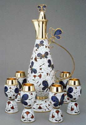 Cloisonné liqueur set Gift to President Nixon from Leonid Brezhnev, General Secretary of the Communist Party of the Soviet Union Vermeil, enamel, pitcher: 11 1/2 x 5 x 3 inches cups: 3 1/2 x 1 1/2 inches