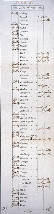 1868 The first Senate vote on the charges facing President Johnson was taken on May 16, 1868. Article XI was called the "omnibus article" because it combined all of the charges against the President. As a result of 19 voting "Not Guilty" and 35 voting "Guilty," the Senate fell 1 vote short of the two-thirds majority required for removal. After a 10-day recess, the Senate reconvened and voted on Articles II and III. In each case, the result was identical: Johnson was not guilty by a single vote. The Senate then voted to end the trial. |