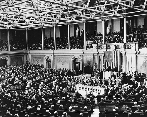 President Franklin Roosevelt addresses a joint session of Congress asking for a declaration of war against Japan, December 8, 1941 By Harris and Ewing ©Stock Montage
