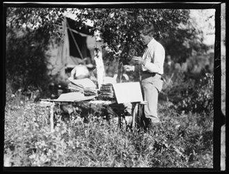 P. H. Dorsett preparing plant specimens on a makeshift table in 1925 on an expedition to Ceylon (Sri Lanka), Sumatra, and Java (Indonesia).