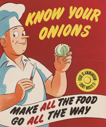 This inventive store display ca. 1917 -18 promotes the potato as a “good soldier” and recommends people eat it “uniform and all.”