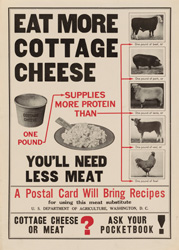 During World War I, the Food Administration under Herbert Hoover promoted “Meatless Mondays.” This poster suggests cottage cheese as a protein substitute.