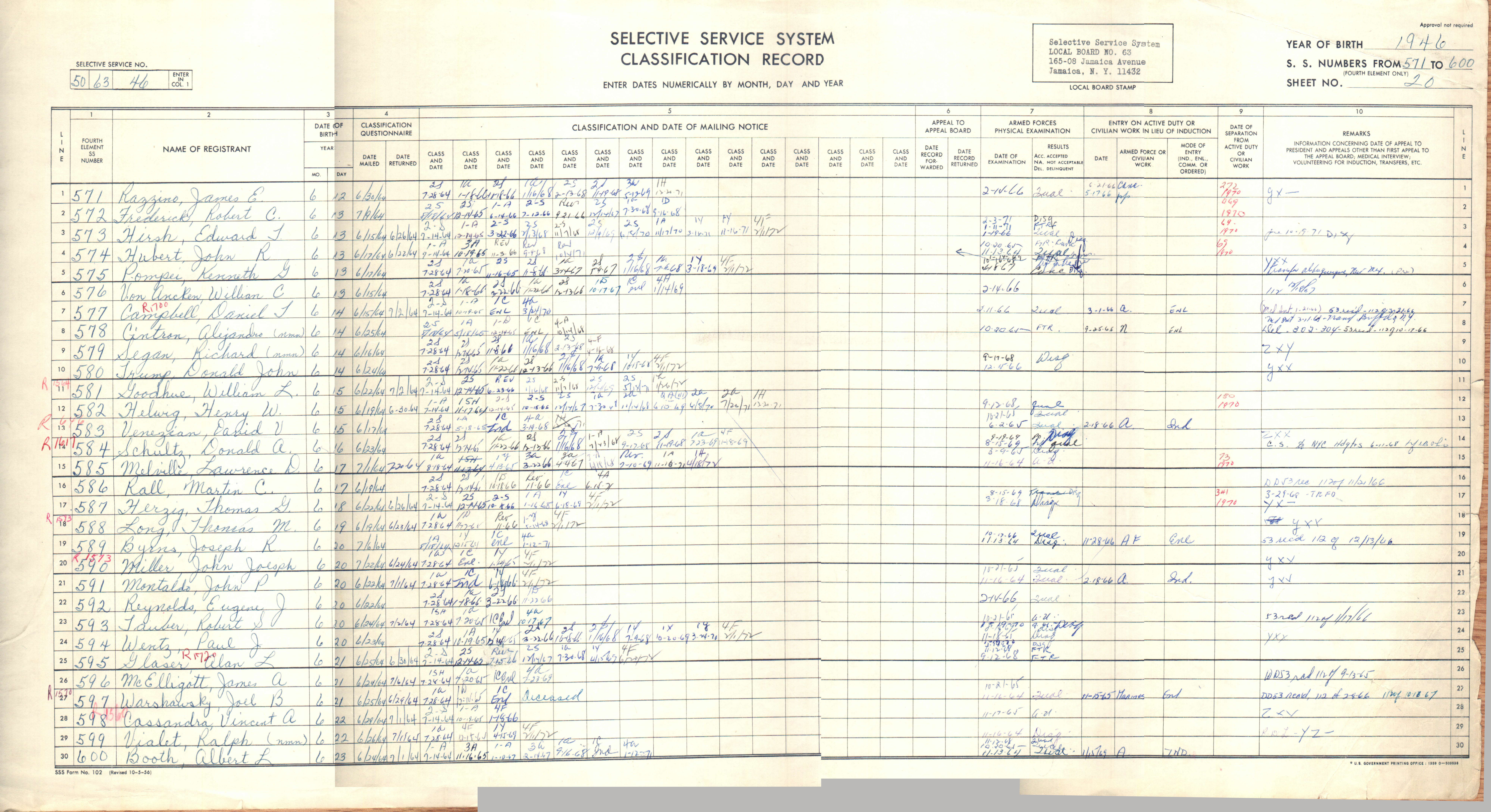 Selective Service SSS Form 102 for Donald John Trump; Selective Service System. New York City Headquarters. 1940-1975, Record Group 147, Records of the National Archives and Records Administration; National Archives at St. Louis, St. Louis, MO. (Entry for Donald John Trump is on line #10) (digital scanned reproduction).