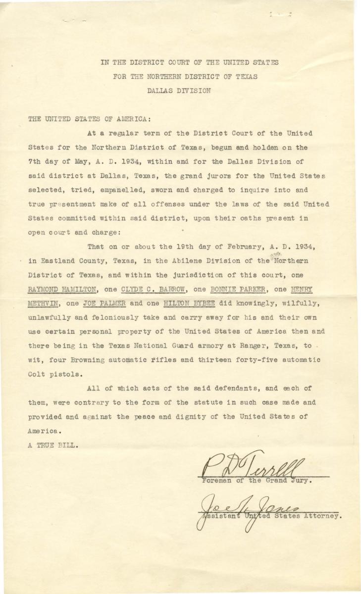 This is an indictment from a Dallas criminal case file for Bonnie Parker and Clyde Barrow, aka Bonnie and Clyde, and four others, resulting from them stealing four Browning automatic rifles and thirteen Colt automatic pistols from the Texas National Guard armory at Ranger, TX, on February 19, 1934. The indictment against the six defendants was filed in May 1934 in the U.S. District Court for the Northern District of Texas, Dallas Division. The arrest warrants were returned to the court on July 16, 1934, with notations “defendant not found in district.”