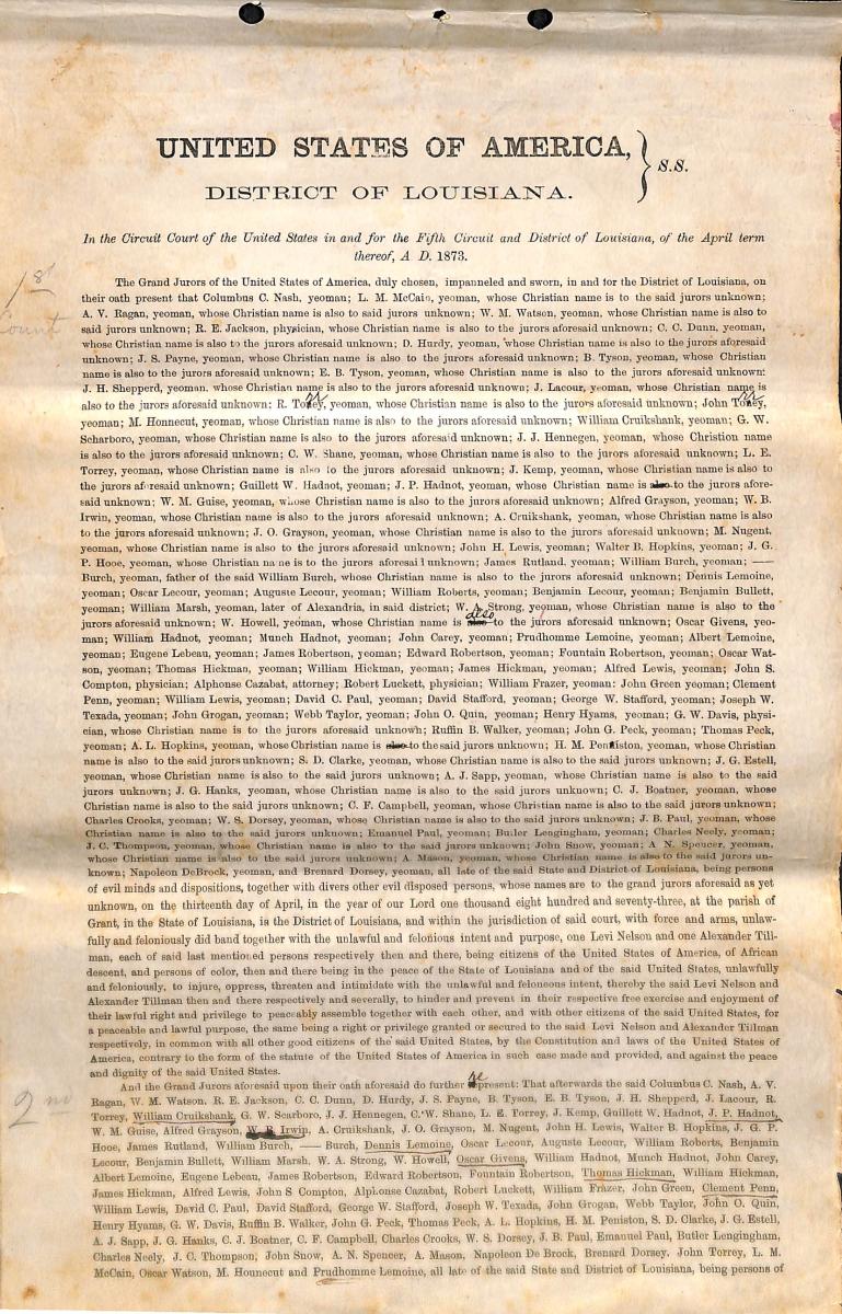 This is the court case U.S. v. Columbus Nash, et. al. This case resulted from the Colfax Riots in 1872. After the ratification of the 15th Amendment in 1870, African American men were intimidated and even barred from voting in elections throughout the South. The Enforcement Acts were passed to protect these men, their voting rights, and their ability to serve on juries, and to ensure they receive equal protection under the law. After the contested 1872 election for governor of Louisiana, a group of white men (most members of the Ku Klux Klan and/or former Confederate soldiers) armed with rifles and a small cannon overpowered Black freedmen and state militia occupying the Grant Parish courthouse in Colfax, LA. This event, known as the Colfax Riot or Massacre, resulted in the death of three white and an unknown number of Black men, upwards of 150 or more. Federal prosecution and conviction of a few perpetrators at Colfax by the Enforcement Acts was appealed to the Supreme Court. In a major case, the court ruled in United States v. Cruikshank that protections of the 14th Amendment did not apply to persons acting individually, but only to the actions of state governments.