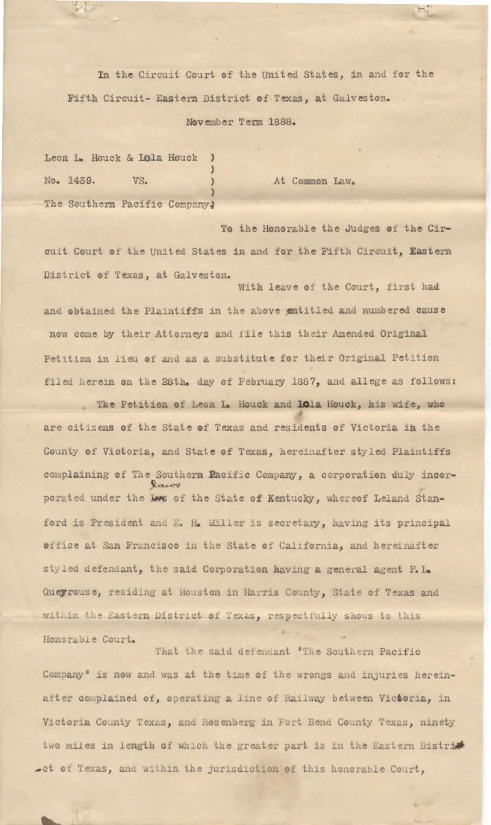 View and download the case Leon L. Houck and Lola Houck v. The Southern Pacific Company on the National Archives Catalog. This document is one example of the many records held in Law Case Files in the National Archives at Fort Worth, TX. You can explore more of our holdings by visiting our online Catalog or by visiting the National Archives at Fort Worth. This record is located within Record Group 21: District Courts of the United States, Series: Law Case Files, 1867–1938. Many of the records in this collection have yet to be digitized. We encourage researchers to visit us onsite to explore these records and learn more about the archival collections held in the National Archives at Fort Worth.